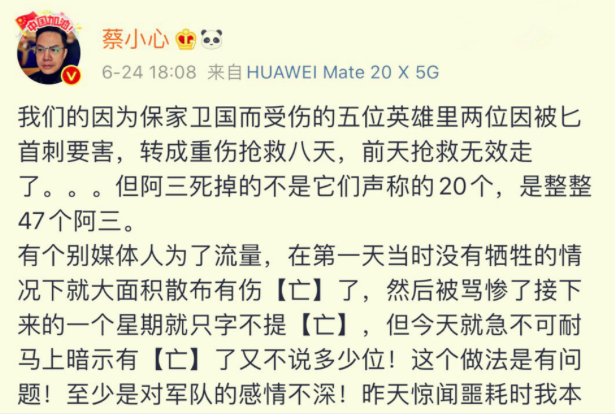 据网媒“香港01”报道,蔡小心在个人微博中写道,“我们的因为保家卫国而受伤的五位英雄里两位因匕首刺要害,转成重伤抢救八天,前天抢救无效走了”。此外,他还指出印度声称的20名印军死亡数字是错误的,实际情况是印军共有47人死亡。
