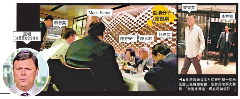《大公报》本月初揭发,8月3日晚油尖旺骚乱发生时,乱港派头目黎智英、李柱铭、陈方安生、何俊仁等人和一个神秘外国男子在中环一餐厅聚头密斟。近日有网媒曝光,席上神秘外国男子原来是美国国家安全专家惠顿(Christian Whiton),并踢爆惠顿近日撰文大言不惭地说,“在中美谈判的艰难时刻,(在香港制造混乱)让中国政府面临这场危机,这完全符合美国的国家利益。”全国政协副主席梁振英在社交网站直斥“黎智英已经不是中国人”,强调这场(反修例)政治运动由第一天开始,就和逃犯条例无关,其真正目的是要通过未来两年半的四场选举夺取香港政权,将香港变天。