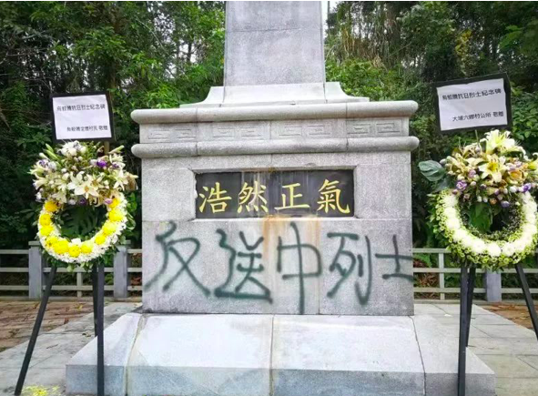 综合《明报》《文汇报》《环球时报》等媒体报道,香港唯一一个国家级抗战纪念设施乌蛟腾的抗日英烈纪念碑17日被人发现遭涂鸦破坏,纪念碑底座正面喷上“反送中列(烈)士”,侧面喷上“愿民主”及“自由不朽”;靠近公路的“乌蛟腾村烈士纪念园”石牌亦被喷上“反送中”三字。