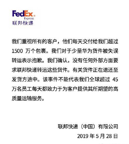 我们重视所有的客户,他们每天交付给我们超过1500万个包裹。我们对于少量华为货件被失误转运表示抱歉。我们确认,没有任何外部方面要求联邦快递转运这些货件。有关货件正在退还至发货方途中。该事件不能代表我们全球超过45万名员工每天都致力于为客户提供其所期望的高质量运输服务。